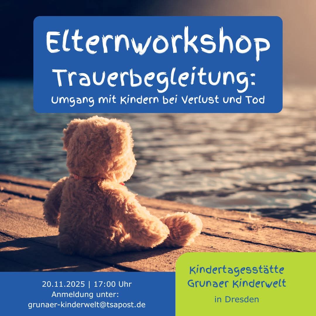 In unserer Kita findet an diesem Tag ein Elternworkshop zum Thema “Trauerbegleitung - Umgang mit Kindern bei Verlust und Tod” statt. Besprochen werden unter anderem: Gesichter der Trauer, Kindertrauer, Umgang mit Trauer, Kommunikation und unterstützungsangebote. Außerdem wird sich viel Zeit für individuelle Fragen und Anliegen der Teilnehmer genommen.