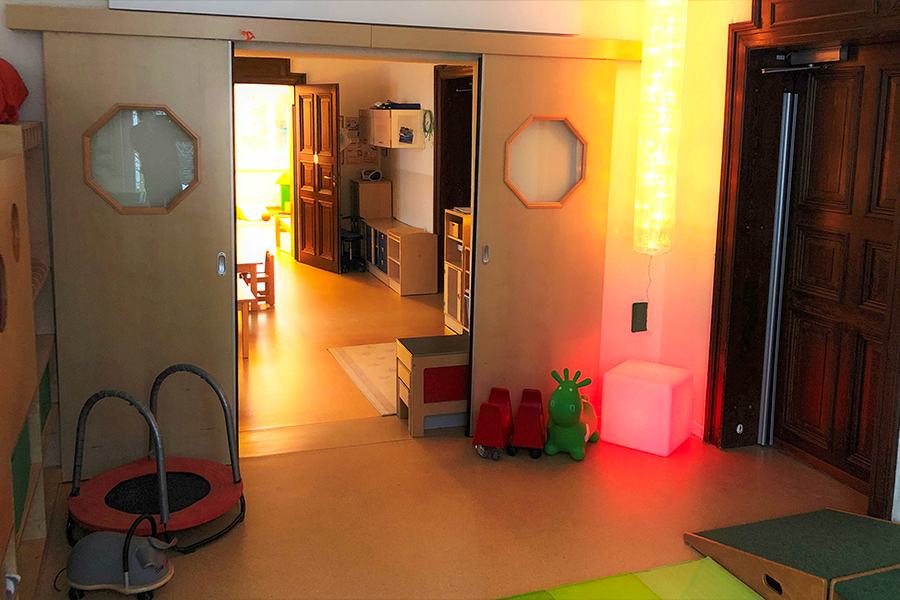 Unsere drei Räume bieten den Kindern verschiedene Formen des Spiels und geben ebenso Raum für Entspannung und Rückzug. Die Bereiche sind grob nach Funktionalität eingeteilt. So haben wir in unserem Bewegungsraum verschiedenen Hochebenen und eine Bewegungsstrecke. Im angrenzenden Bereich, dem Kinderrestaurant des KKBs, bieten wir viel Platz zum Malen, Spielen und Essen. Dort haben wir eine Ecke mit Bauelementen und verschiedenen Tischspielen eingerichtet. So können die Kinder ihrer Kreativität freien Lauf lassen und eigene Fähigkeiten entwickeln. Im dritten Raum befinden sich eine Puppenecke, zwei Hochebenen mit Höhlen zum Verstecken und viel Platz zum Verweilen. Da unsere Räume alle miteinander verbunden sind, haben die Kinder jederzeit die Möglichkeit alle Bereiche zu nutzen.