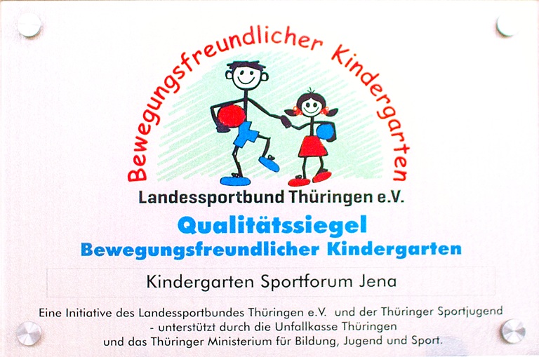 Zum bereits vierten Mal übergibt uns Yvonne Streit und Linda Seibt vom Stadtsportbund Jena diesen Titel, welcher an unterschiedliche Kriterien gebunden ist. Der Kindergarten Sportforum arbeitet seit 12 Jahren nach dem Sport- und Bewegungskonzept und kooperiert hierbei mit verschiedenen Sportvereinen und Kooperationspartnern. Am heutigen Tag fand das Vorschulprojekt „Pfiffix“ in unserem Bewegungsraum statt. Dieses Projekt umfasst 25 Einheiten über 60 Minuten. Es gliedert sich in fünf themenspezifische Reisen. In jeder Freundewelt werden unterschiedliche Ziele zur Gesundheitsförderung verfolgt. Dabei spielen die Schulung der konditionellen und koordinativen Fähigkeit genauso eine Rolle wie die spielerische Wissensvermittlung zu den Themen Ernährung und Entspannung. Dieses Angebot fand bereits zum vierten Mal in Kooperation mit der mhplus Betriebskrankenkasse und der Kindersportschule des SV Schott Jena e.V. statt. Pfiffix-Coach Markus Ringleb tanzte zu Beginn mit den 20 Kindern zum Pfiffix-Lied. Die Kinder werden durch das gleichnamige Maskottchen begleitet. Am Ende des Kurses erhalten alle Kinder eine Urkunde und ein Pfiffix-Puzzle.