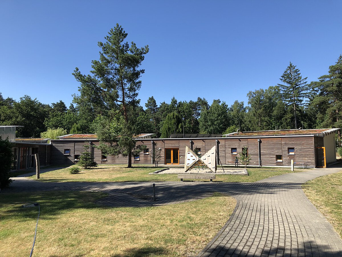Unser schöner Kindergarten liegt versteckt im Wald und bietet viel Platz zum Spielen, Lernen und Entdecken. Wir haben Platz für insgesamt 293 Kinder, davon 157 Plätze für Krippenkinder, verteilt auf 4 Häuser. Alle Häuser sind über einen Glasgang miteinander verbunden. Zudem können wir bis zu 12 Integrationskinder aufnehmen. In den Häusern 1 und 2 werden Kinder im Kindergartenalter und in den Häusern 3 und 4 unsere Krippenkinder betreut. Unser Team setzt sich aus staatlich anerkannten Erzieher:innen, Heilerziehungspfleger:innen und Sozialpädagog:nnen und Mitareiter:innen im technischen Bereich zusammen.